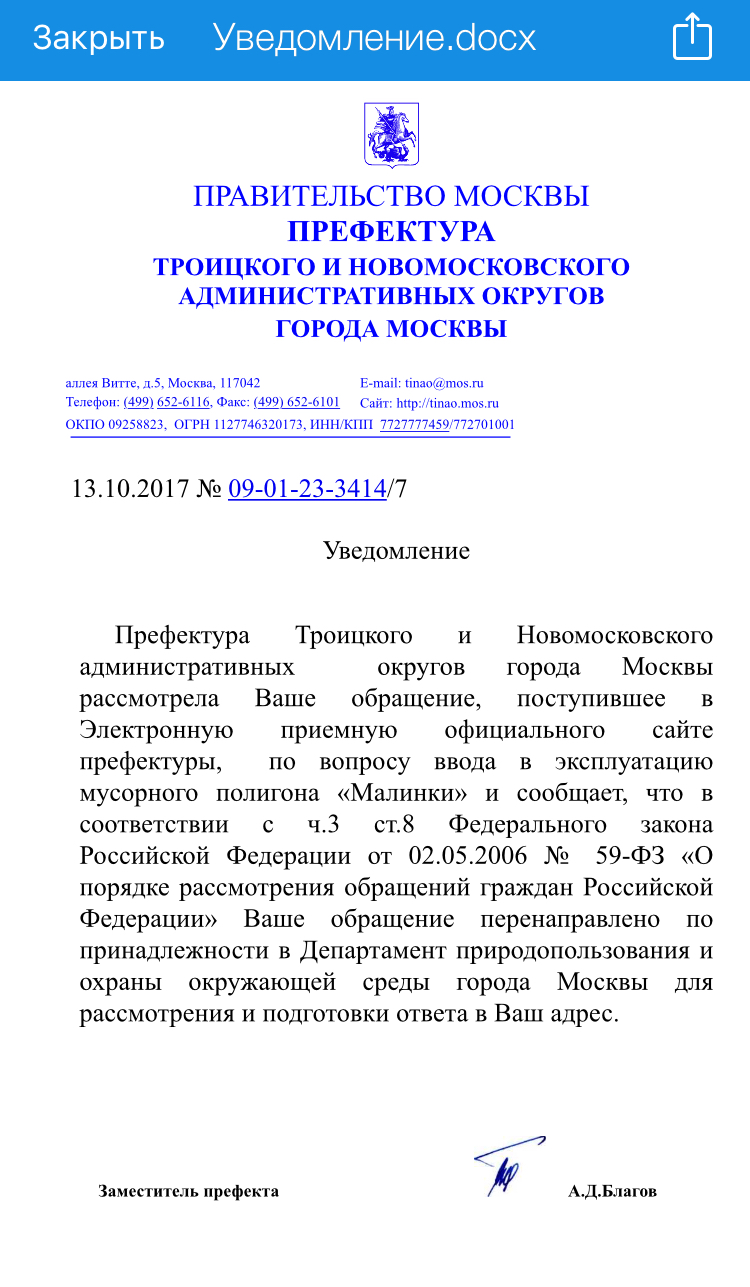 Префект Троицкого и Новомосковского округов столицы Дмитрий Набокин заявил, что сейчас экологические проблемы на свалке в Новой Москве решены: «Это не уровень решений префектуры, поэтому я не уполномочен принимать такие решения. Да, действительно была ужасная ситуация, оттуда вывели оператора, который там работал, провели культивацию, очистку территории, поэтому сейчас там все благополучно. Риски оценивать могут эксперты-экологи — я, к сожалению, не специалист в этой области. Опрос среди жителей мы не проводили, но, по крайней мере, у меня обращений от граждан нет».