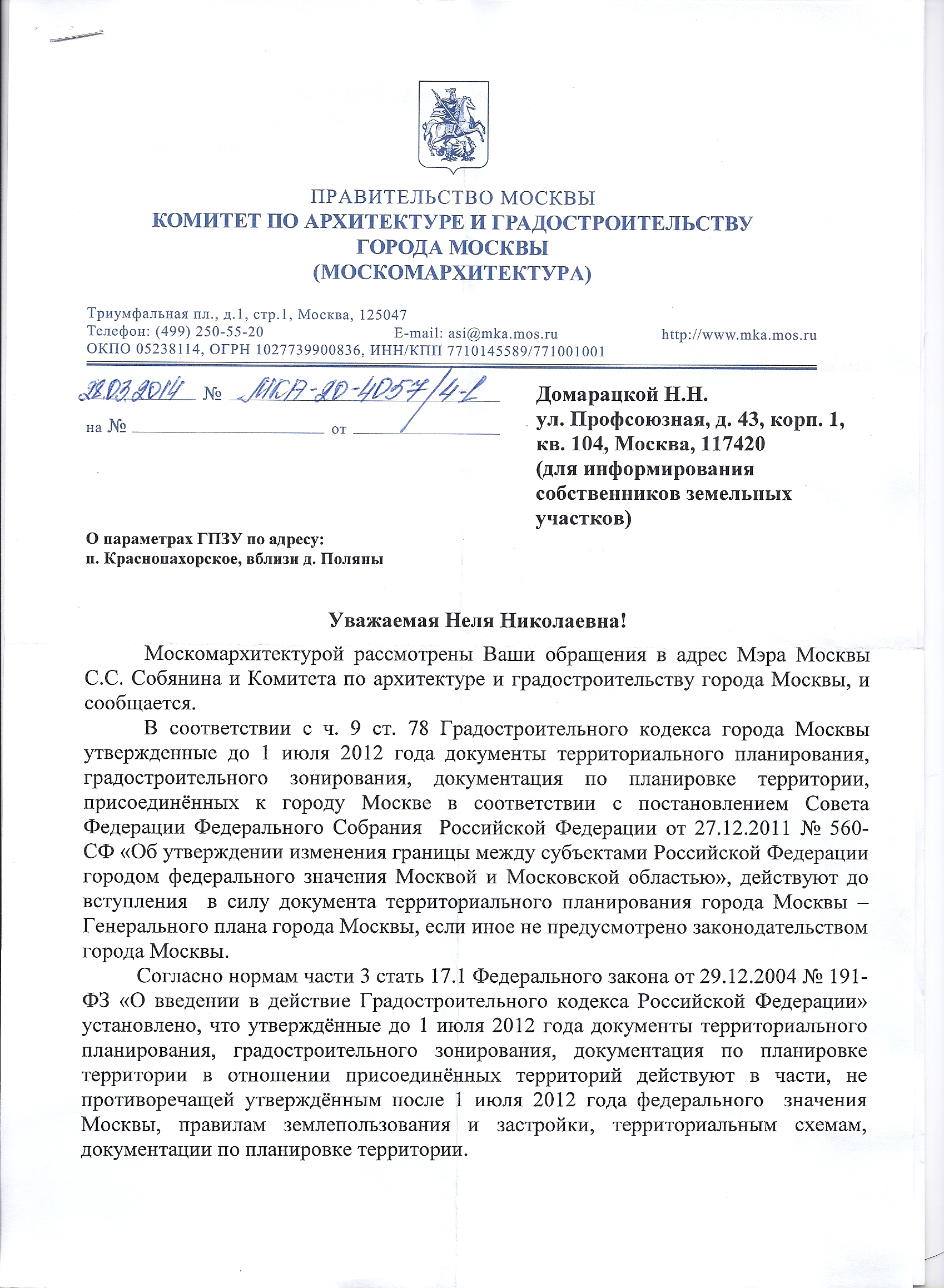 я писала относительно тех собственников, которые получили или в процессе получения ГПЗУ, с целью получения процента застройки участка в соответствии со строительными нормами, а письмо от Москомархитектуры я разослала всем кто прислал мне свою электронную почту, моя почта Nelli-Dom@yandex.ru