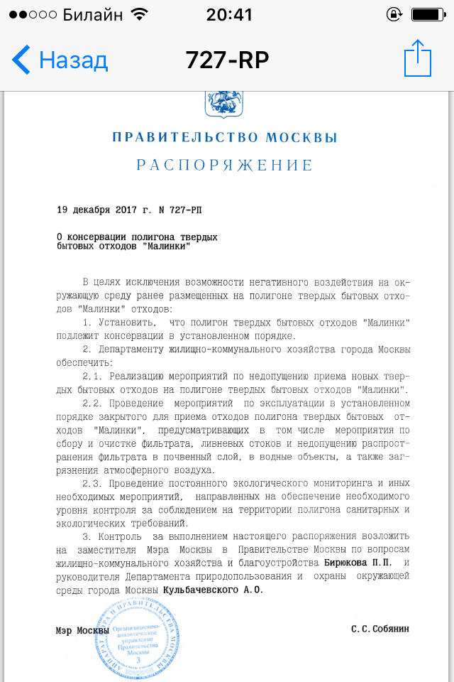 Разговаривал с активистами из инициативной группы "СтопМалинки". Они очень обеспокоены принятием этого Распоряжения по КОНСЕРВАЦИИ. Актив предлагал и выдвигал совсем иные пункты по Малинкам, среди которых были "Закрытие", "Рекультивация" и др......Ничего подобного не принято. ((((